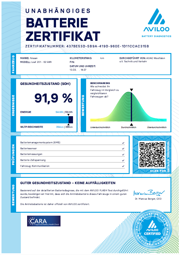 Der AVILOO Premiumtest: Ein ausführliches Zertifikat des Batteriezustandes. Der Premiumtest findet während der Fahrt statt und über den gesamten Batterieladezyklus.