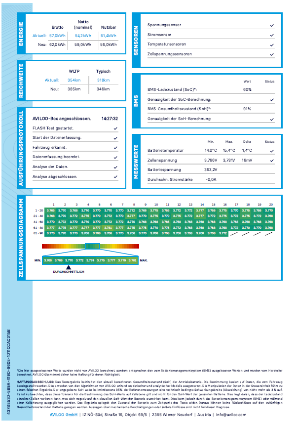 Um diese Frage zu beantworten, bieten wir für Euch den AVILOO -Batterietest an. Die Installation ist einfach und gut beschrieben. Die AVILOO – Box sendet unzählige Daten an die AVILOO DATA CLOUD. Hier werden die Daten analysiert und man erhält am Ende die Auswertung mit einem AVILOO – Zertifikat.